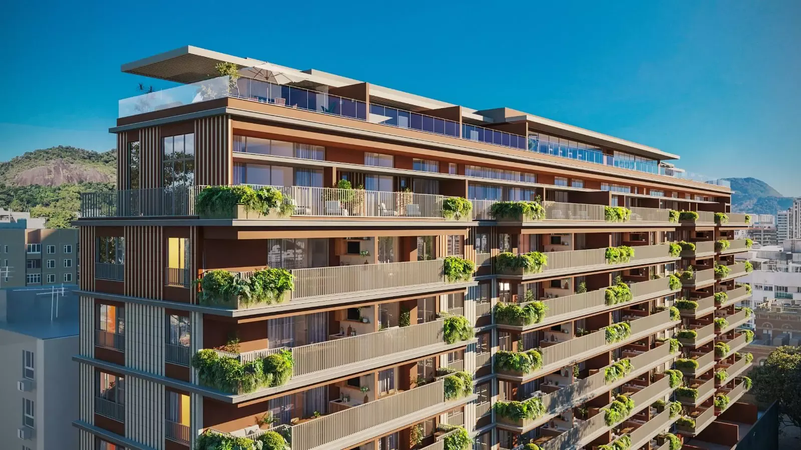 • Fachada a avarandada com elementos cerâmicos e textura “terracor”, com jardineiras, dando um destaque e ao mesmo tempo leveza ao projeto.