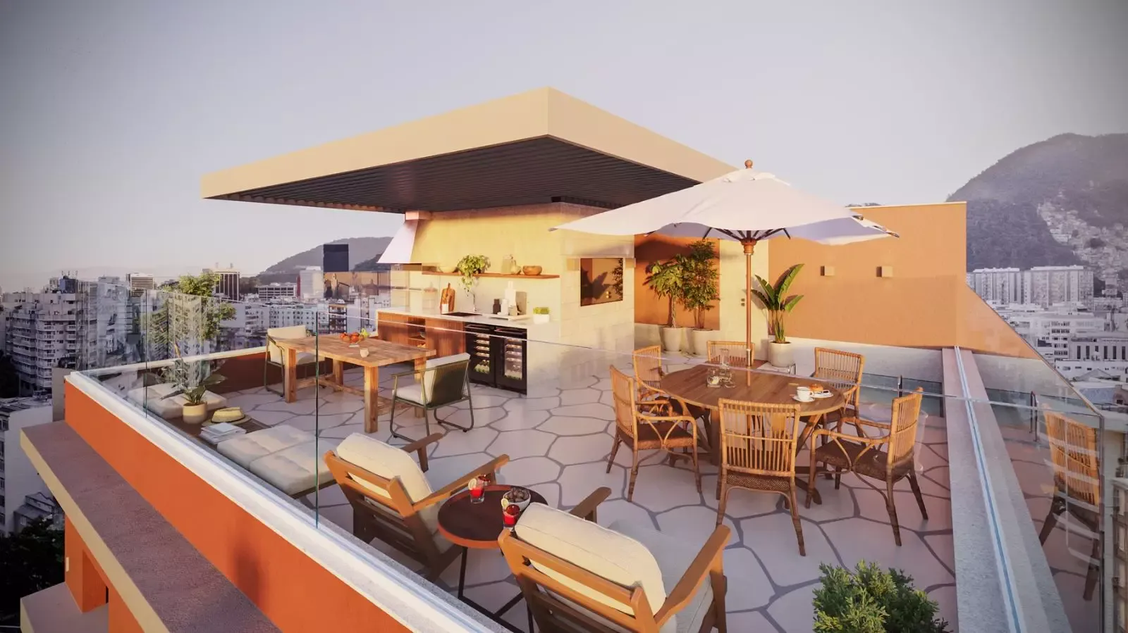 Lazer completo no Rooftop além de 3 coberturas privativas com piscina e churrasqueira para uso comum dos moradores mediante reserva "day use."